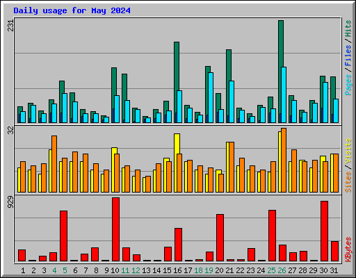 Day | Hits | Files | Pages | Visits | Sites | KBytes | ||||||