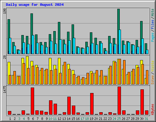 Day | Hits | Files | Pages | Visits | Sites | KBytes | ||||||